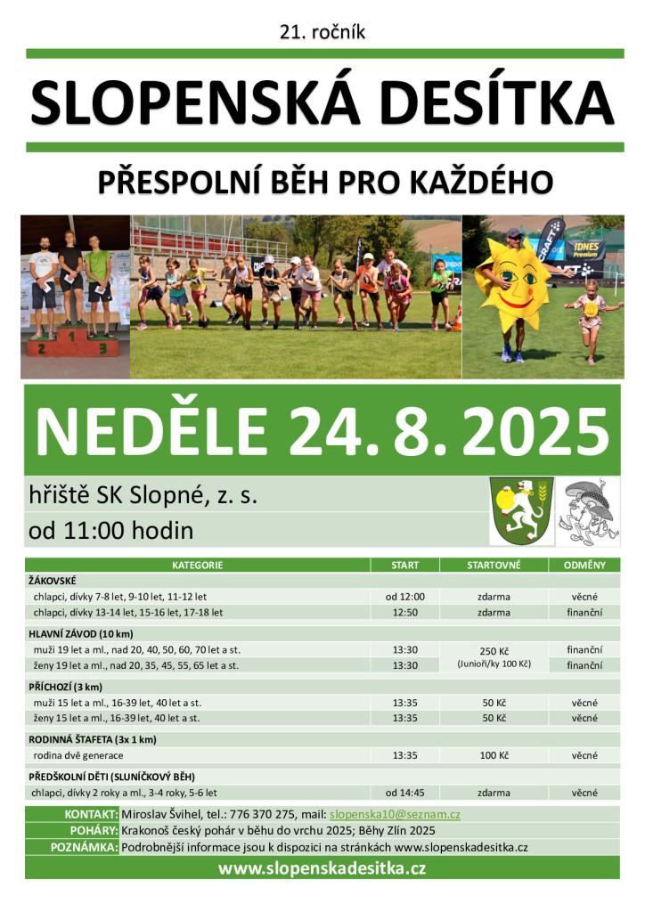 Slopenská desítka se blíží! Připojte se k nám v neděli 24. srpna 2025 na hřišti SK Slopné, kde proběhne 21. ročník této populární akce. Na účastníky čeká pestrá nabídka závodů, včetně hlavního závodu na 10 km, a kategorií pro děti a rodiny. Vstupné je zdarma pro žákovské kategorie a předškolní děti, ostatní kategorie mají mírné startovné, s možností vyhrát zajímavé ceny.