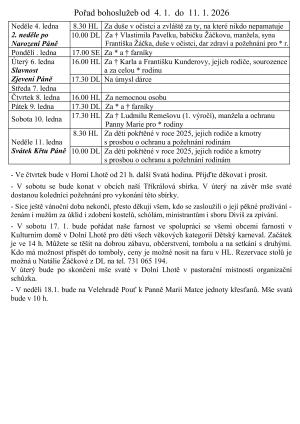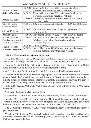 V týdnu od 11. do 18. ledna 2026 se budou konat bohoslužby s různými úmysly. V neděli 18. ledna se koná mše svatá s poděkováním za 85 let života. Během tohoto týdne se také farnost zapojí do Týdne modliteb za jednotu křesťanů a pořádá Dětský karneval, který je určen pro všechny věkové kategorie.