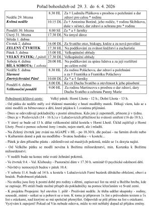 V týdnu od 22. do 29. března 2026 se uskuteční řada bohoslužeb a modlitebních akcí. V pondělí 23. března se koná mše svatá s mariánským večeřadlem. V průběhu týdne proběhnou i další mše a pobožnosti, včetně Zvěstování Páně a křížových cest, na které jsou farníci srdečně zváni.