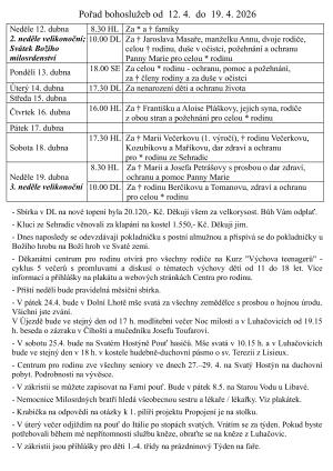 V týdnu do 19. dubna 2026 se konají bohoslužby s různými úmysly. Farnost také pořádá aktivity pro rodiče, seniory a děti, včetně kurzu o výchově teenagerů. Důležité je také připomenout pravidelnou měsíční sbírku, která se uskuteční v neděli.