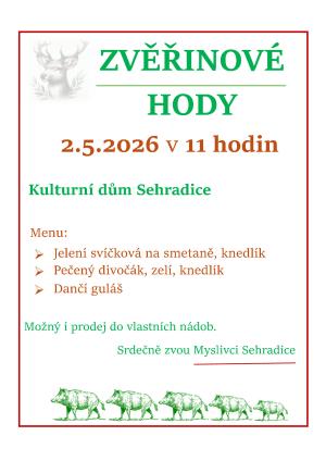 Srdečně vás zveme na Zvěřinové hody, které se konají 2. května 2026 v 11 hodin v Kulturním domě Sehradice. Na menu se objeví jelení svíčková na smetaně, pečený divočák se zelím a dančí guláš. Pro zájemce je také připravena možnost prodeje pokrmů do vlastních nádob.