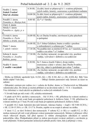 Od 9. do 16. února 2025 se konají bohoslužby a další aktivity farnosti, včetně Adoračního dne, mše svaté k Národnímu týdnu manželství a sportovního odpoledne pro děti.