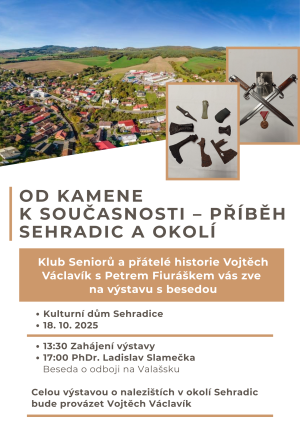 Kulturní dům Sehradice pořádá výstavu "Od kamene k současnosti - příběh Sehradic a okolí" dne 18. října 2025 od 13.30 h v sále KD Sehradice.