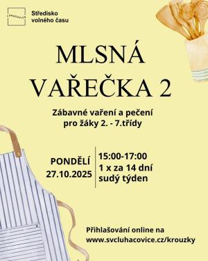 Zábavné vaření a pečení je kroužek určený pro žáky 2. až 7. třídy, který se koná v Středisku volného času v Luhačovicích.