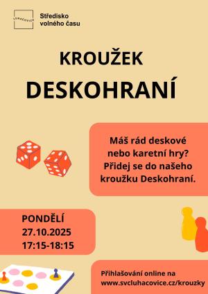 Pokud máte rádi deskové nebo karetní hry, srdečně vás zveme do našeho kroužku Deskohraní. Kroužek probíhá v pondělí 27. října 2025 od 17:15 do 18:15 a je skvělou příležitostí, jak se pobavit a poznat další nadšence.