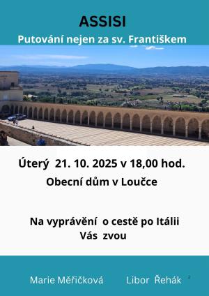 Obecní dům v Loučce zve všechny zájemce na vyprávění o cestě po Itálii, které se uskuteční v úterý 21. října 2025 v 18:00 hodin. Přijďte si poslechnout příběhy a zajímavosti z této krásné země.