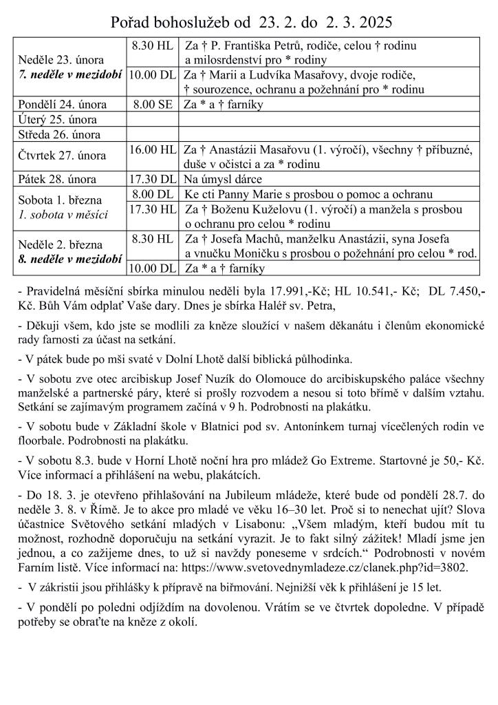 Od 23. února do 2. března 2025 se uskuteční řada bohoslužeb a akcí. Nedělní mše zahrnují modlitby za zesnulé a požehnání pro rodiny. V týdnu proběhnou biblické půlhodinky a setkání pro rozvedené páry. Dále se koná turnaj ve floorbale a přihlašování na Jubileum mládeže v Římě.