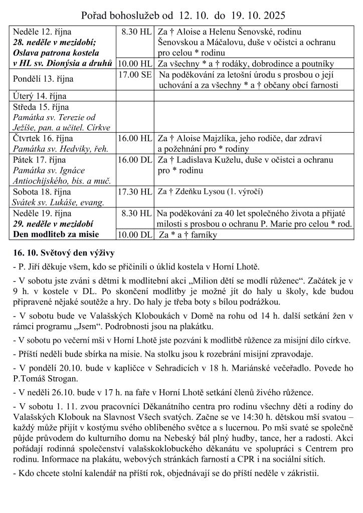 V týdnu od 12. do 19. října 2025 se konají bohoslužby v naší farnosti. V pondělí 13. října bude od 17.00 hodin mše na poděkování za letošní úrodu. Dále se koná památka sv. Terezie od Ježíše a sv. Hedviky. V pátek 17. října se uskuteční mše za Ladislava Kuželu, v sobotu 18. října mše za Zdeňku Lysou. Neděle 19. října nabídne mši na poděkování a modlitby za misie. V sobotu 16. října se koná modlitební akce „Milion dětí se modlí růženec“. Zveme všechny k účasti na těchto akcích.