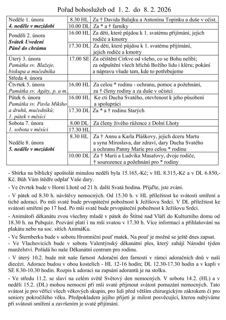 V týdnu od 1. do 8. února 2026 se v naší obci uskuteční bohoslužby, na které jsou všichni srdečně zváni. Přijďte se podělit o duchovní zážitky a prožít společné chvíle v naší komunitě.