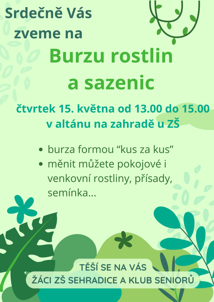 Srdečně vás zveme na Burzu rostlin a sazenic, která se koná ve čtvrtek 15. května od 13.00 do 15.00 hodin v altánu na zahradě u základní školy. Tato akce probíhá formou „kus za kus“, takže si můžete vyměnit nejen pokojové, ale i venkovní rostliny, přísady či semínka. Těšíme se na vaši účast, žáci ZŠ a Klub seniorů ze Sehradic.
