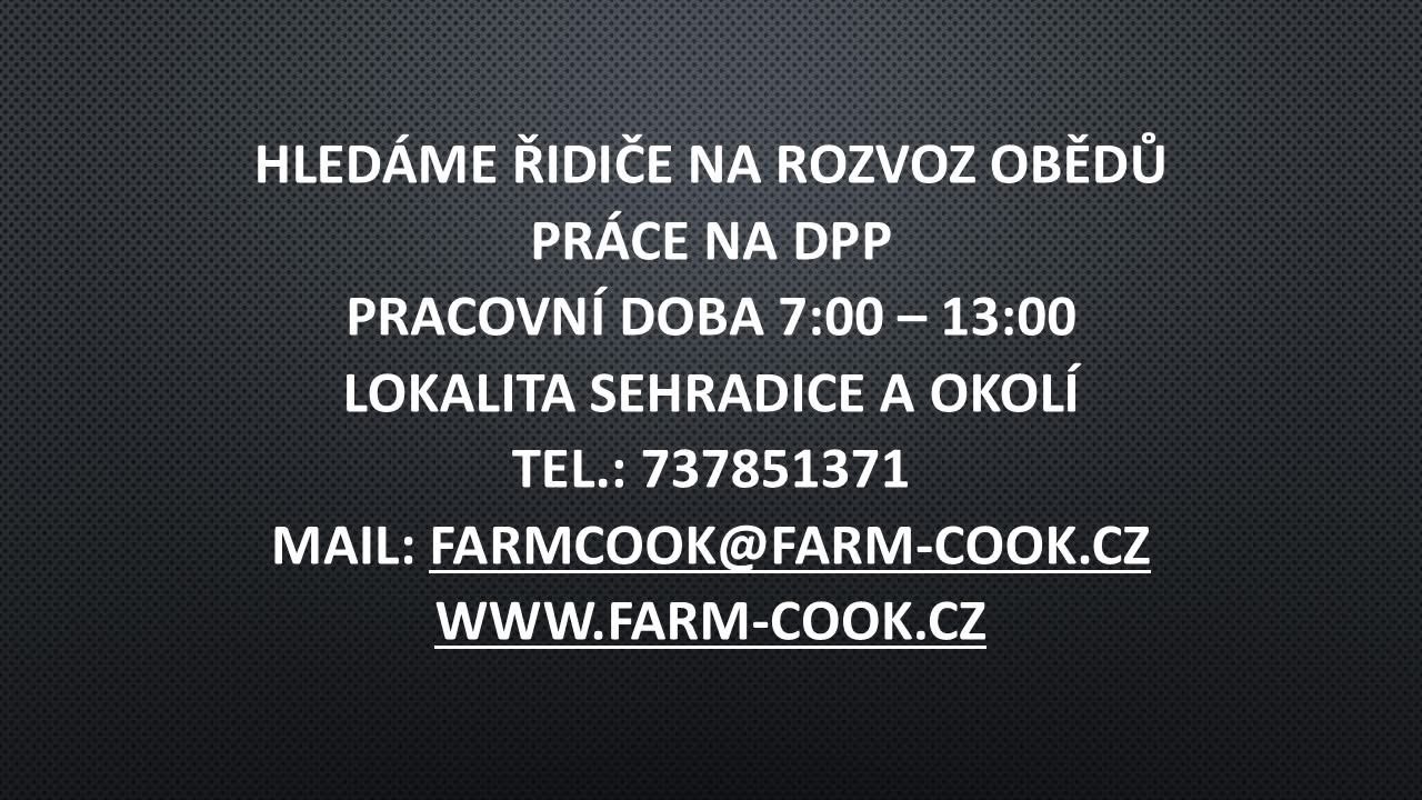 Hledáme řidiče na rozvoz obědů v lokalitě Sehradice a okolí. Nabízíme práci na dohodu o provedení práce s pracovní dobou od 7:00 do 13:00. Zájemci nás mohou kontaktovat na telefonním čísle 737851371 nebo e-mailem na farmcook@farm-cook.cz. Více informací najdete na našich webových stránkách www.farm-cook.cz.