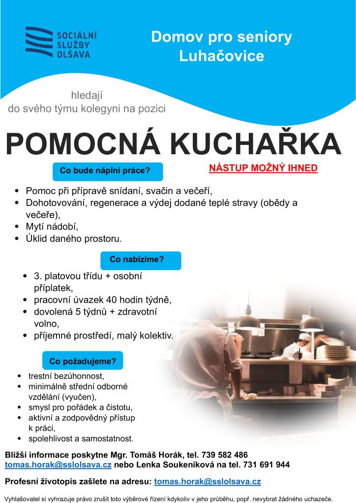 V současné době vyhlašujeme výběrové řízení na pozici pomocné kuchařky. Nabízíme 3. platovou třídu, 40 hodinový pracovní úvazek a 5 týdnů dovolené. Požadujeme trestní bezúhonnost, minimálně střední odborné vzdělání a aktivní přístup k práci. V případě zájmu zašlete profesní životopis na uvedenou e-mailovou adresu nebo kontaktujte naši pracovnici.
