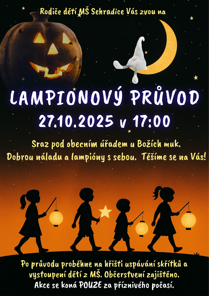 Rodiče dětí z Mateřské školy Sehradice Vás srdečně zvou na lampionový průvod, který se uskuteční 27. října 2025 v 17:00. Sraz je pod obecním úřadem u Božích muk, kde se sejdeme s lampiony a dobrou náladou. Po průvodu se na hřišti můžete těšit na uspávání skříťků a vystoupení dětí z MŠ. Občerstvení bude zajištěno. Akce se koná pouze za příznivého počasí, proto doufáme, že nám počasí bude přát.