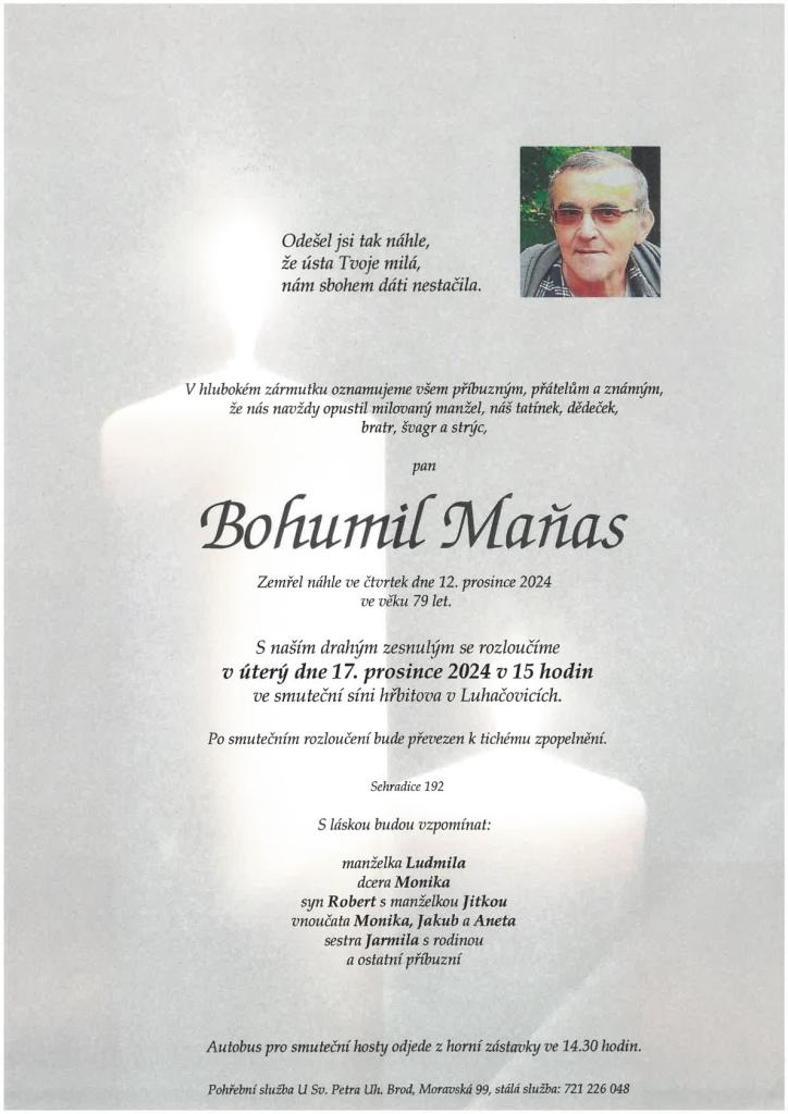 Rodina Maňasova s bolestí v srdci oznamuje, že pohřeb pana Bohumila Maňase se uskuteční v úterý 17. prosince v 15 hodin ve smuteční síni v Luhačovicích. Autobus odjede ve 14.30 od Hájenky.