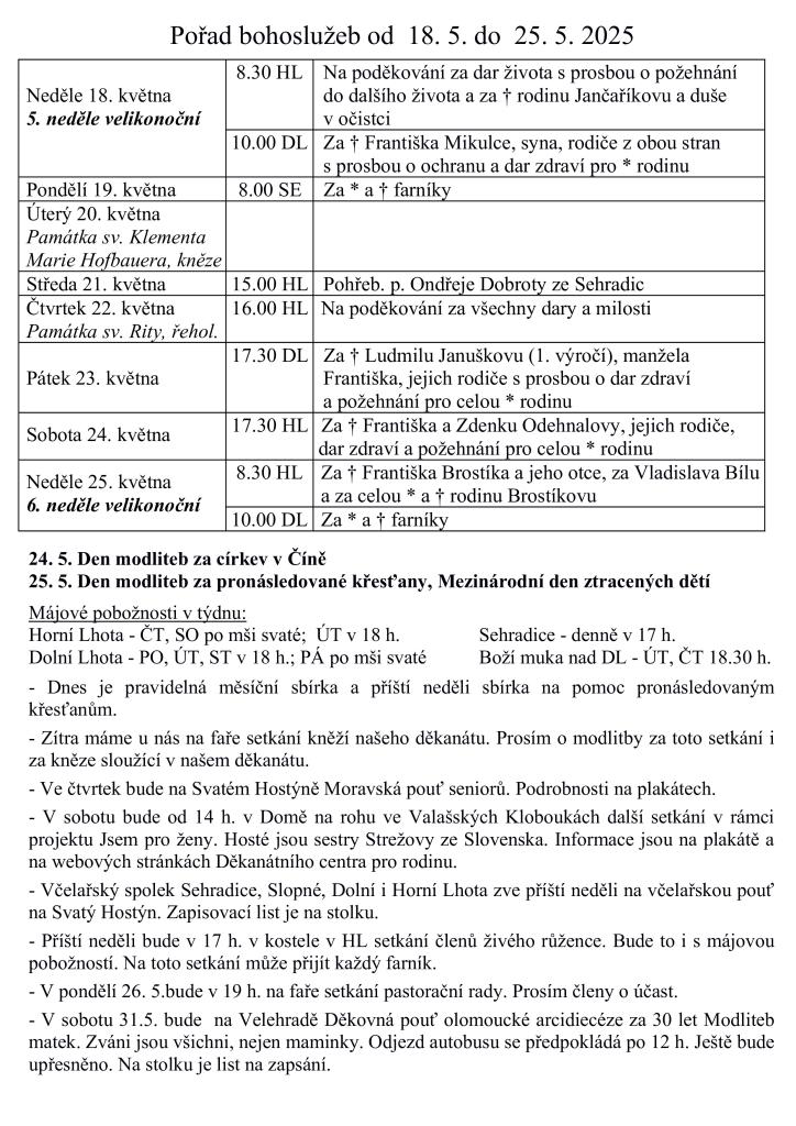 V týdnu od 18. do 25. května 2025 se konají bohoslužby a speciální modlitby. V neděli 24. května si připomínáme Den modliteb za církev v Číně a v neděli 25. května Den modliteb za pronásledované křesťany. Během týdne se také uskuteční setkání farníků, májové pobožnosti a další akce pro místní komunitu.