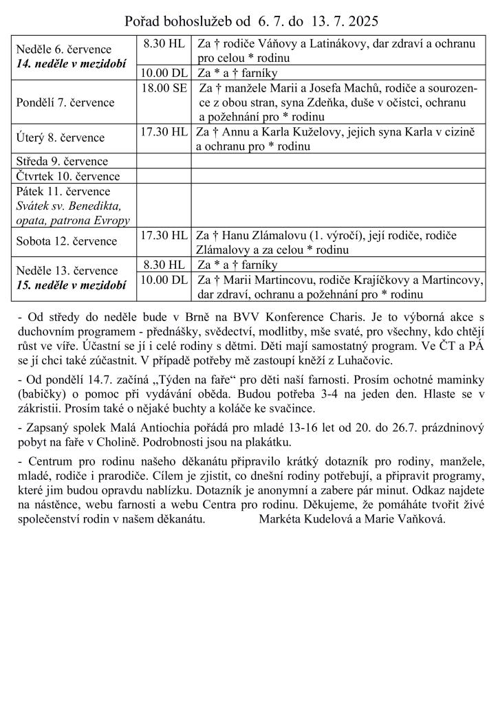V týdnu od 6. do 13. července 2025 se koná řada bohoslužeb, včetně svátku sv. Benedikta, a také důležité akce pro rodiny a mládež. Od středy do neděle proběhne Konference Charis v Brně, která nabízí duchovní program s přednáškami a modlitbami. Od pondělí 14. července začne „Týden na faře“ pro děti, kde budou potřeba dobrovolníci na pomoc s obědy. Zapsaný spolek Malá Antiochia organizuje prázdninový pobyt pro mladé a Centrum pro rodinu připravilo dotazník pro rodiny, aby zjistilo jejich potřeby.