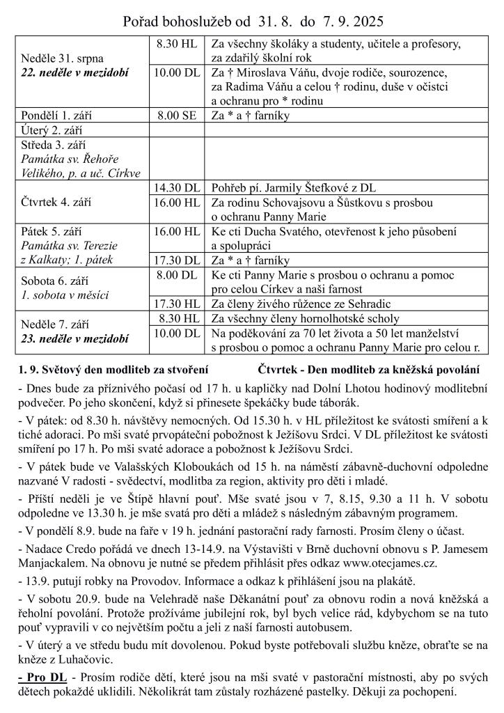 Dne 1. září, v den Světového dne modliteb za stvoření, proběhne odpoledne modlitební setkání u kapličky nad Dolní Lhotou. V pátek se uskuteční duchovní odpoledne ve Valašských Kloboukách a příští neděli nás čeká hlavní pouť ve Štípě.