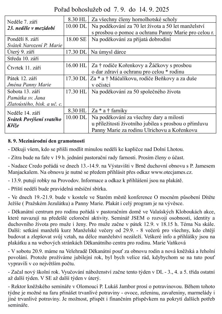Od 7. do 14. září 2025 se konají bohoslužby a různé akce v naší farnosti, včetně duchovní obnovy a pravidelné sbírky.
