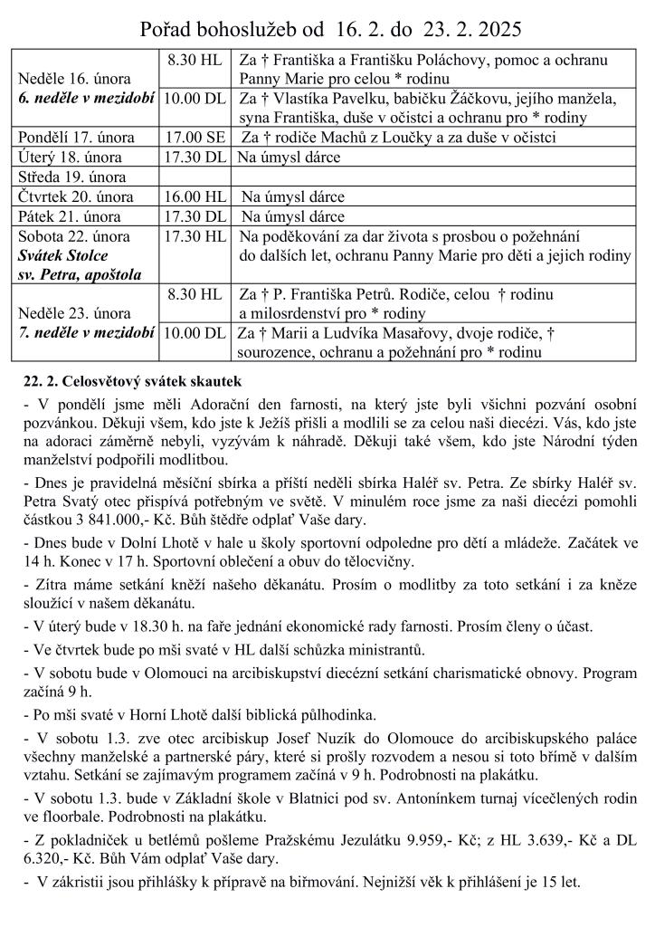 V týdnu od 16. do 23. února 2025 se konají následující bohoslužby:- Neděle 16. února: 8.30 HL, 10.00 DL.- Středa 19. února: O O.- Sobota 22. února: 17.30 HL.- Neděle 23. února: 8.30 HL, 10.00 DL.Dále proběhne pravidelná měsíční sbírka a sbírka Haléř sv. Petra. V Dolní Lhotě se uskuteční sportovní odpoledne pro děti. Kněží budou mít setkání, členové ekonomické rady se sejdou na faře. V sobotu 1. března se koná setkání pro rozvedené páry a turnaj ve floorbale. Přihlášky na biřmování jsou k dispozici v zákristii.