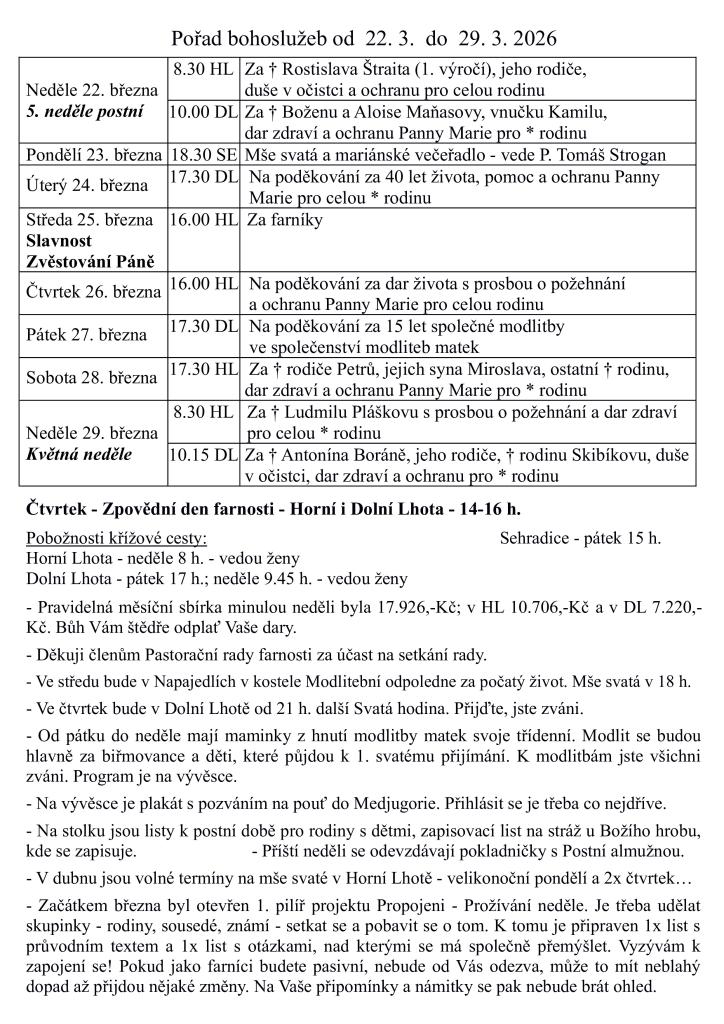 V týdnu od 22. do 29. března 2026 se uskuteční řada bohoslužeb a modlitebních akcí. V pondělí 23. března se koná mše svatá s mariánským večeřadlem. V průběhu týdne proběhnou i další mše a pobožnosti, včetně Zvěstování Páně a křížových cest, na které jsou farníci srdečně zváni.