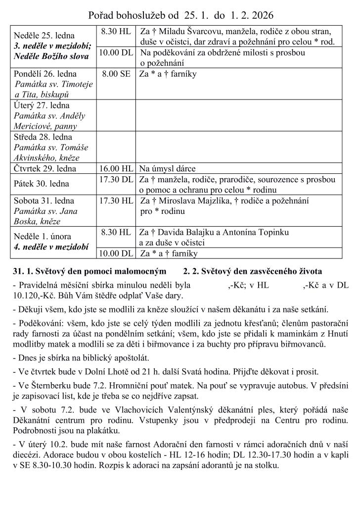 V týdnu od 25. ledna do 1. února 2026 se v naší farnosti koná řada bohoslužeb. 31. ledna se uskuteční mše za Miroslava Majzlíka, rodiče a požehnání pro rodinu. V neděli 1. února proběhne pravidelná měsíční sbírka a také se budete moci zúčastnit Svaté hodiny ve čtvrtek 5. února v Dolní Lhotě.