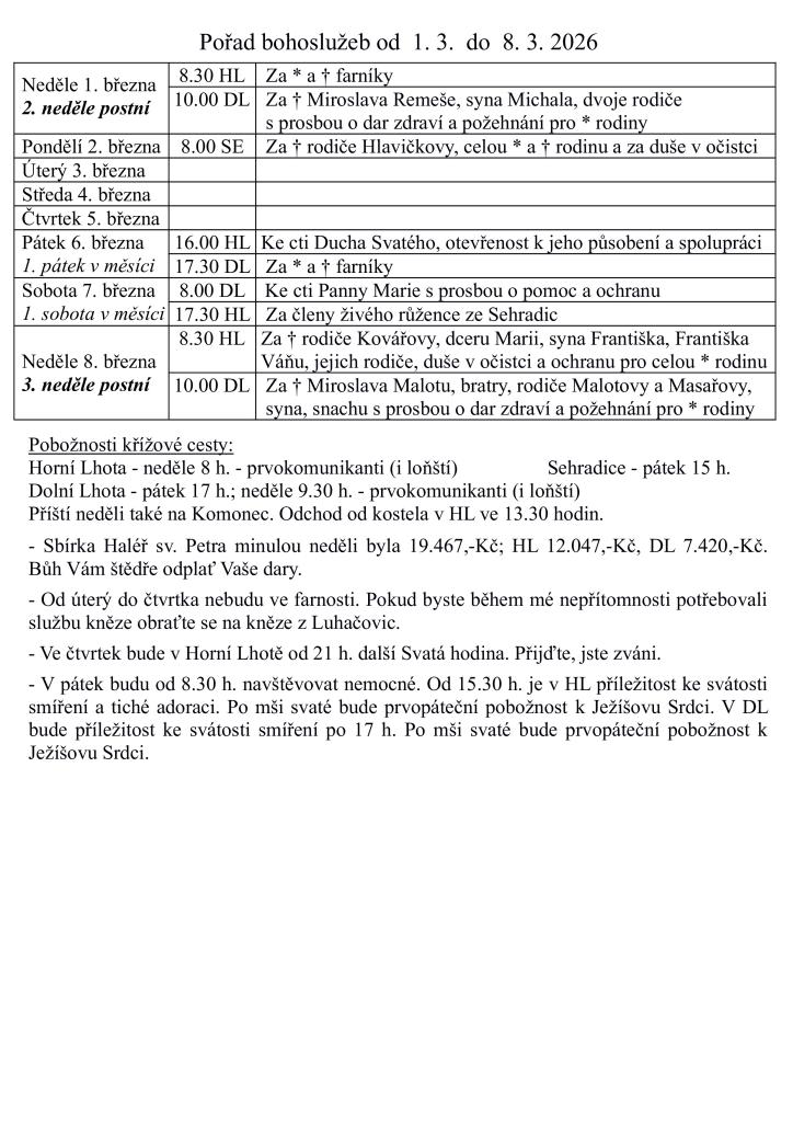 Týden od 1. března 2026 přináší bohoslužby, které se konají v různých dnech a časech. Ve čtvrtek se koná Svatá hodina a v pátek bude příležitost ke svátosti smíření. V neděli 8. března jsou naplánovány křížové cesty a další mše svaté.