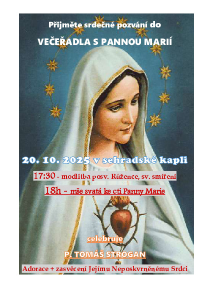Přijměte pozvání do Večeřadla s Pannou Marií, a to 20. 10. 2025 od 17.30 h v sehradské kapli.