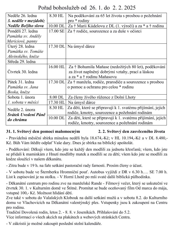 Pořad bohoslužeb zahrnuje různé památky a speciální mše od 26. ledna do 2. února 2025. Uskuteční se sbírky na biblický apoštolát, modlitby za jednotu křesťanů a setkání pastorační rady farnosti. V sobotu se koná Hromniční pouť a biblická půlhodinka. Děkanátní centrum pro rodinu pořádá různé akce, jako je manželské Rande - Filmový večer a Děkanátní valentýnský ples, s možností hlídání dětí. Také je možnost přihlásit se na tradiční Dovolenou rodin v Jeseníkách. Další informace jsou dostupné na plakátech a webových stránkách Centra.