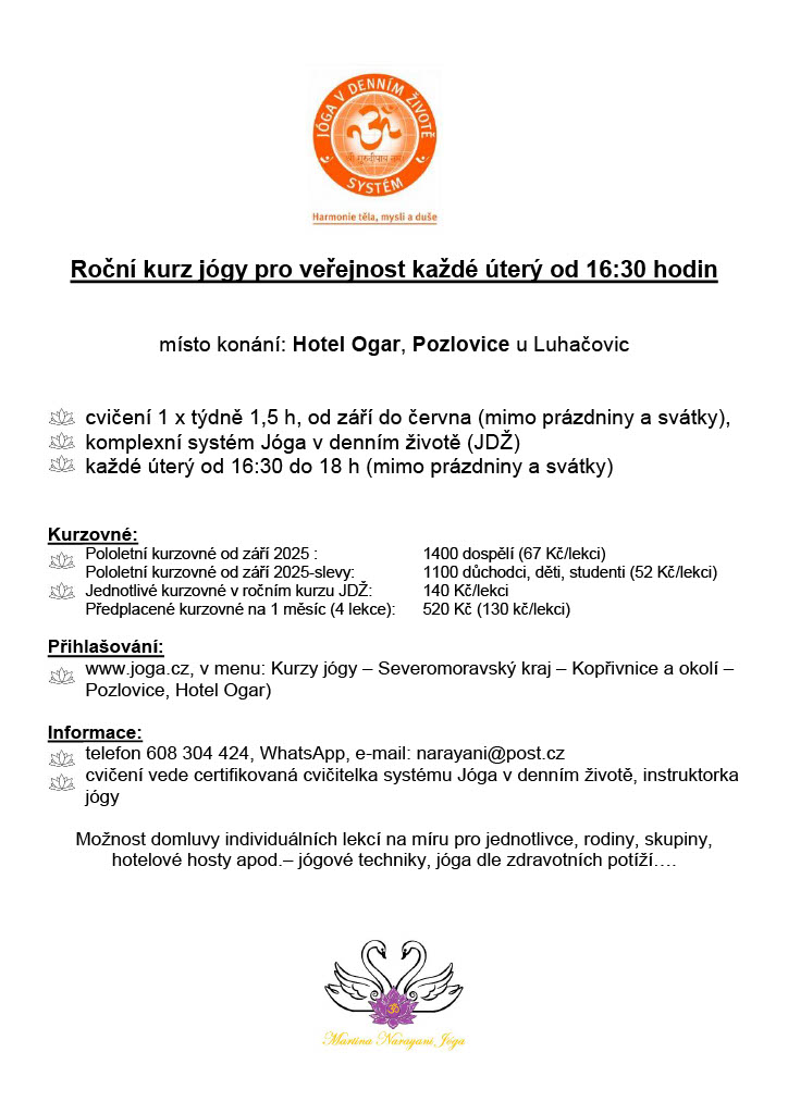 Od září 2025 se v Hotelu Ogar v Pozlovicích koná roční kurz jógy, který probíhá každé úterý od 16:30 do 18:00. Cvičení je zaměřeno na komplexní systém Jóga v denním životě a je určeno pro širokou veřejnost. Kurzovné je nastaveno na 1400 Kč pro dospělé, se slevami pro důchodce, děti a studenty. Pro zájemce jsou také k dispozici individuální lekce na míru.