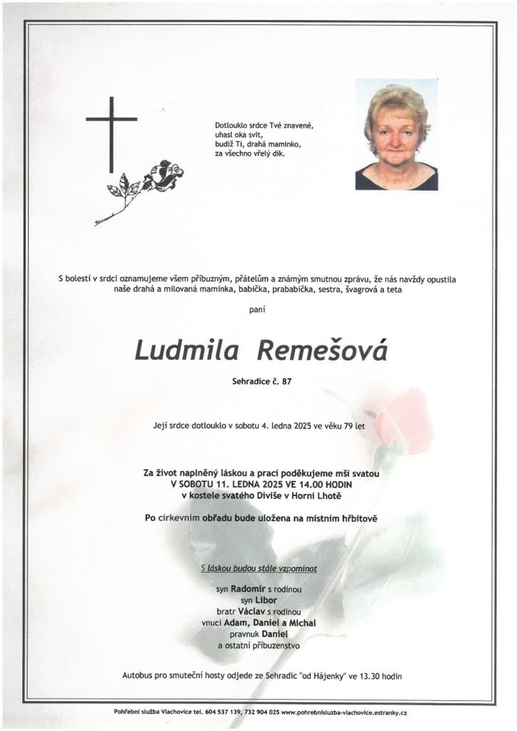 S bolestí v srdci oznamujeme všem příbuzným, přátelům a známým, že nás navždy opustila Ludmila Remešová. Zemřela v sobotu 4. ledna 2025 ve věku 79 let. Poslední rozloučení proběhne mší svatou v sobotu 11. ledna 2025 ve 14:00 hodin v kostele svatého Diviše v Horní Lhotě. Po obřadu bude uložena na místním hřbitově. Autobus pro smuteční hosty odjede ze Sehradic ve 13:30 hodin.
