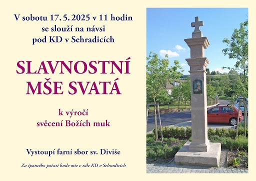 V sobotu 17. května 2025 se v 11 hodin uskuteční slavnostní mše svatá na návsi pod OÚ. Tato mše je významnou událostí, která si připomíná výročí svěcení Božích muk.