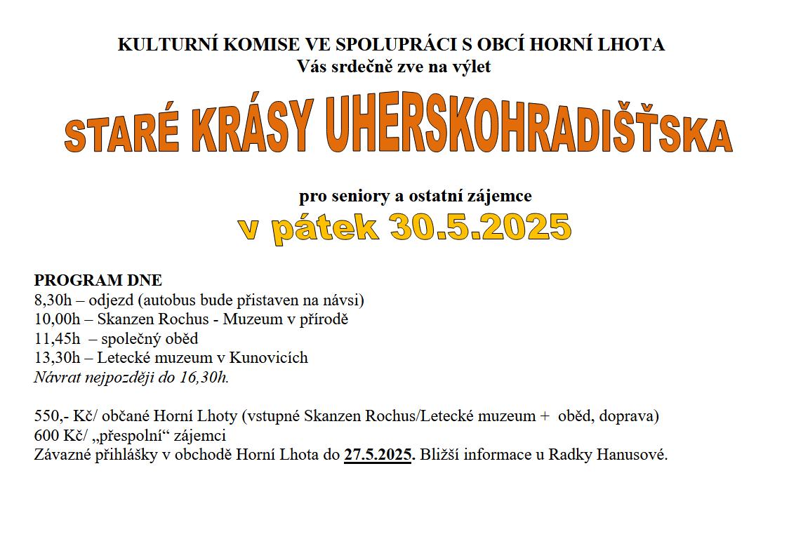 KULTURNÍ KOMISE a obec Horní Lhota pořádají výlet pro seniory a ostatní zájemce do Uherskohradišťska. Program zahrnuje návštěvu Skanzenu Rochus a Leteckého muzea v Kunovicích, společný oběd a odjezd autobusu z návsi v 8:30. Cena výletu činí 550 Kč pro občany Horní Lhoty a 600 Kč pro „přespolní“ zájemce. Závazné přihlášky je nutné odevzdat do 27. května 2025 v obchodě Horní Lhota.