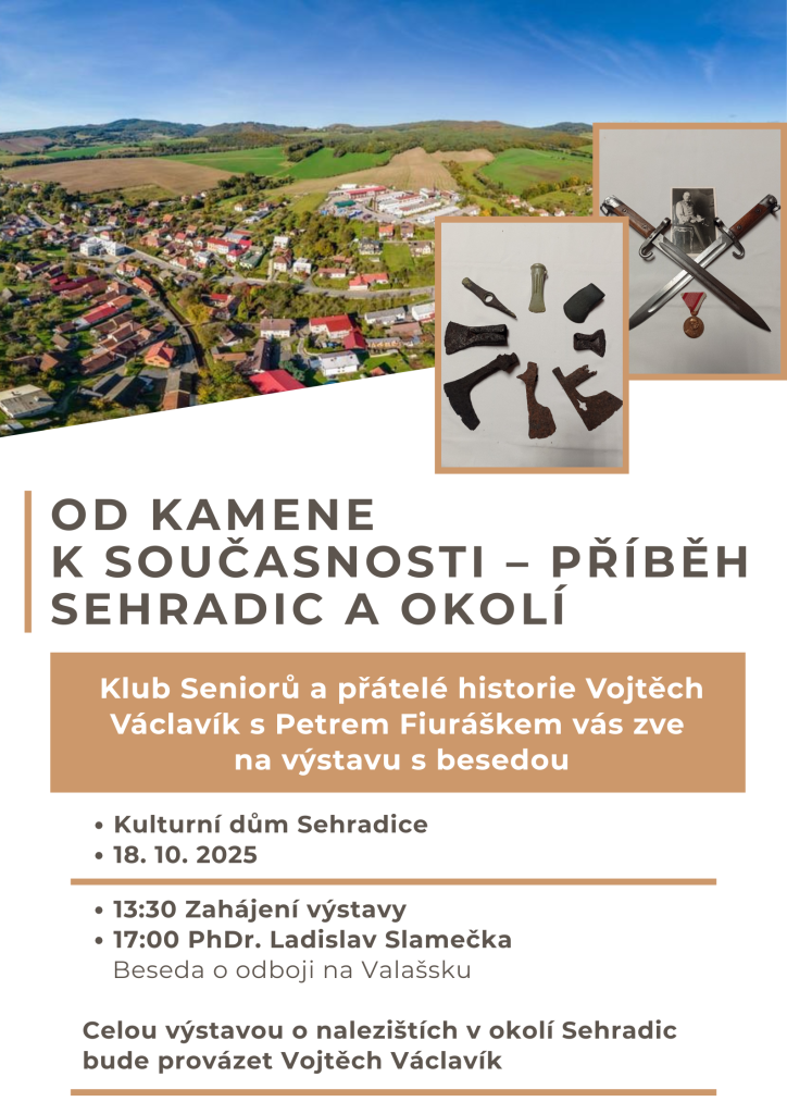 Kulturní dům Sehradice zve na výstavu "Od kamene k současnosti - příběh Sehradic a okolí", která se uskuteční 18. října 2025. Akce začne v 13:30 a návštěvníci se mohou těšit na besedu s PhDr. Ladislavem Slamečkou na téma odboje na Valašsku, která proběhne od 17:00. Vojtěch Václavík bude provázet celou výstavou, která se zaměří na naleziště v okolí Sehradic. Účast na výstavě přislíbila také známá archeoložka PhDr. Jana Langová, která bude odpovídat na případné otázky návštěvníků. Srdečně zveme všechny zájemce o historii a kulturu regionu.