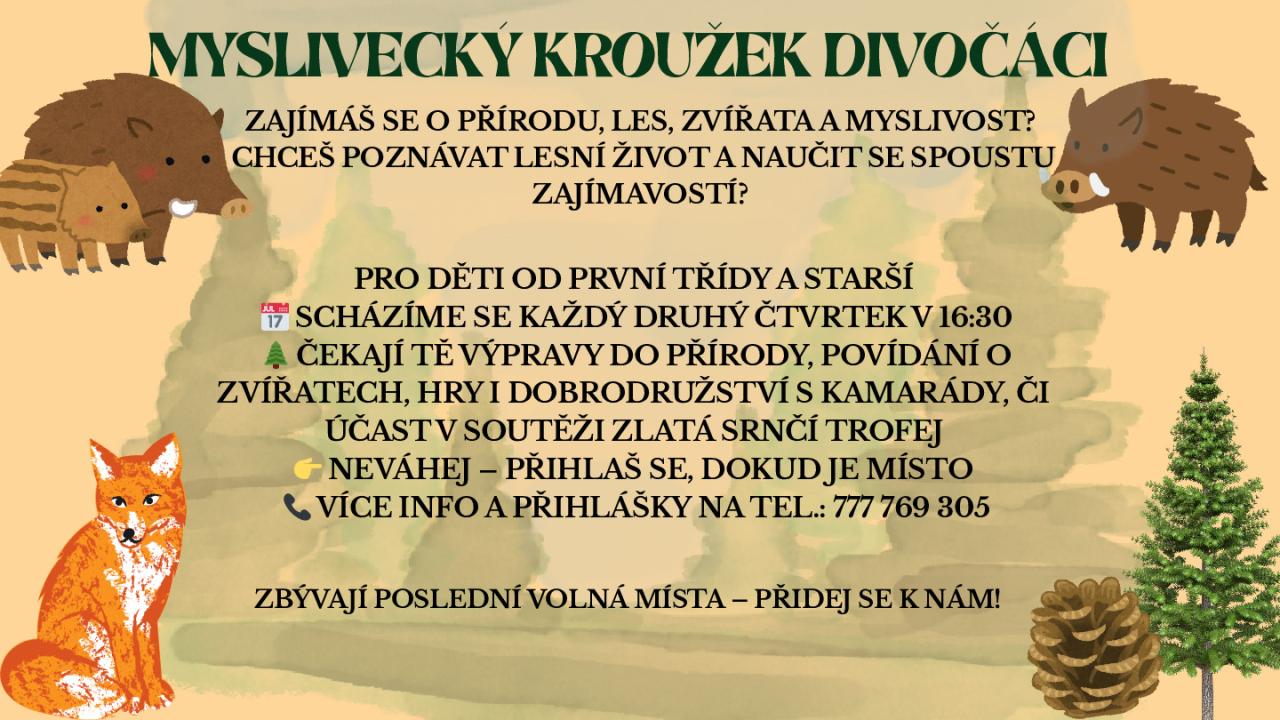 Myslivecký kroužek Divočáci nabízí skvělou příležitost pro děti od první třídy a starší, jak se seznámit s lesními ekosystémy, zvířaty a myslivostí. Setkáváme se každý druhý čtvrtek v 16:30, kde na vás čekají výpravy do přírody, hry a povídání o zvířatech. Nezapomeňte se přihlásit, protože zbývají poslední volná místa!