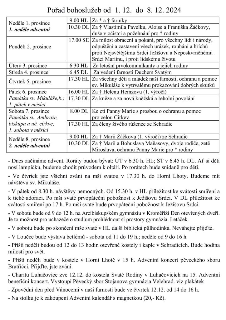 Bohoslužby v týdnu od 1. 12. - 8. 12.