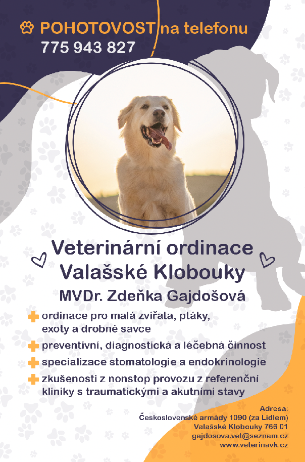 Veterinární ordinace MVDr. Zdeňky Gajdošové se nachází ve Valašských Kloboukách a poskytuje komplexní péči pro malá zvířata, ptáky, exoty a drobné savce. Ordinace se zaměřuje na preventivní, diagnostickou a léčebnou činnost, včetně specializace na stomatologii a endokrinologii. Díky zkušenostem z nonstop provozu z referenční kliniky se MVDr. Gajdošová dokáže efektivně zabývat traumatickými a akutními stavy. Ordinace je umístěna na adrese Československé armády 1090, Valašské Klobouky.